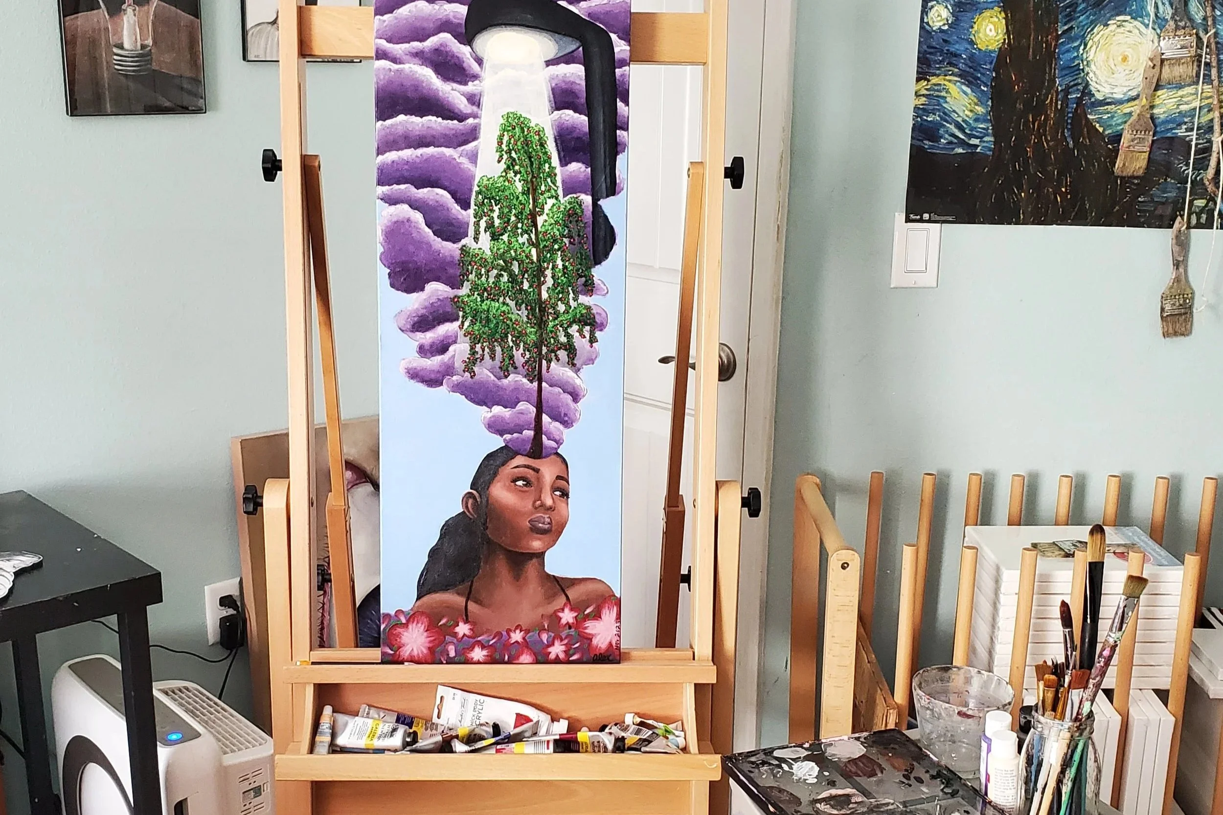 Flying Squirrel Studio was created to allow me to express myself and create community through creativity. My artwork leans heavily into surrealism and mixes media together to create all kinds of stuff, from acrylic painting to papermaking, with the emotional support of my pets :).